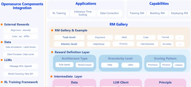 阿里云 ModelScope 开源的 RM-Gallery,是一站式奖励模型平台的典型代表,集训练、构建与应用于一体,支持任务级与原子级奖励模型的高吞吐、容错实现。其核心特性包括: