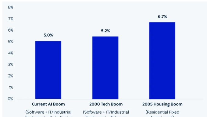 图1:与人工智能相关的资本性支出占美国GDP约5%(图1),并以每年约10%的速度增长,与20世纪90年代末/21世纪初的科技繁荣相当
