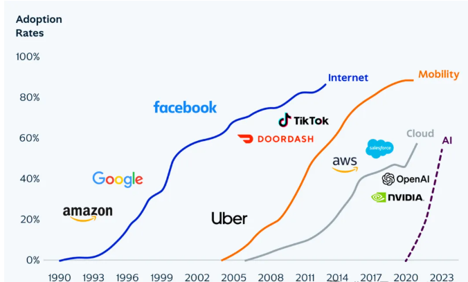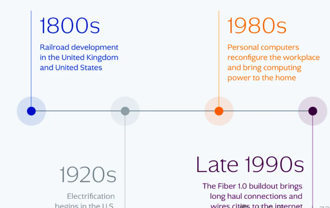 某些技术(如铁路和互连网)的价值在于连接性。但人工智能是一个横向的计算层,它渗透到工作流程、创意工作、分析、日常任务和决策的各个环节。它在众多领域同时提升生产力基线,而非像互连网经济中的消费者应用和广告网络那样,将价值集中于少数目的地。一个更恰当的比较是电气化:生产力的提升并非随着电灯的出现立即实现,而是直到工厂开始围绕电动机进行重新设计时才真正发生。这为后续的速度提升、效率优化和自动化浪潮铺平了道路,并持续影响至今。
