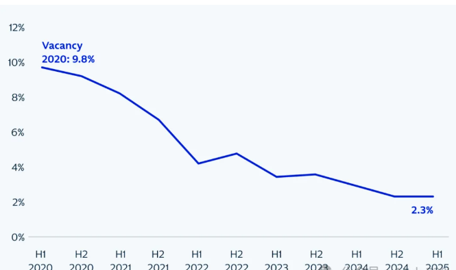 来源:JLL Research,截至2025年6月。注:托管空置率指现有数据中心中未使用的空间/电力容量。