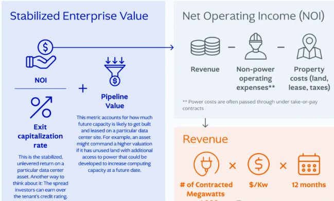 投资者通常通过收入收益率或每交付兆瓦(MW)的企业价值来评估数据中心,随后再基于合同的稳固性、扩张潜力和电力的确定性进行调整。图7阐释了基于收入收益率的简化单位经济模型。
