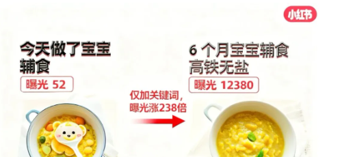之前我们有个做母婴辅食的小白客户,刚开始发笔记只写“今天做了宝宝辅食,很简单”,曝光一直卡在50左右;后来加上“6个月宝宝辅食泥 高铁无盐”这个关键词,没改其他内容,3天后曝光直接涨到1.2万,还引来了20个宝妈私信问食谱——