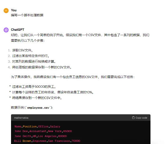 例如,“编写一个脚本处理数据”,它马上回给你生成一个脚本。