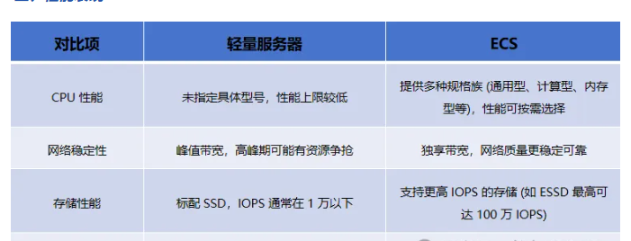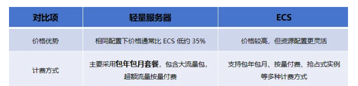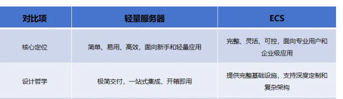 核心差异一句话概括:轻量服务器牺牲了灵活性和扩展性,换取了更低的价格和更简单的使用体验;而 ECS 提供了完整的基础设施能力,但使用门槛和成本更高。