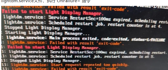## 发现这个服务确实为failed,报错如下:Failed to start Light Display Manager lightdm.service: Service RestartSec=100ms expired, scheduling restart. ightdm.service: Scheduled restart job, restart counter is at 5.lightdm.service:Triggering OnFailure= dependencies.