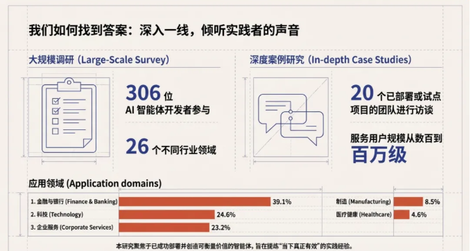 本研究并未停留在理论层面,而是深入一线,采用了大规模调研与深度案例研究相结合的方式。研究团队调研了306位AI智能体开发者,覆盖26个不同行业领域;同时对20个已部署或试点项目的团队进行了深度访谈,这些项目的服务用户规模横跨数百至百万级。