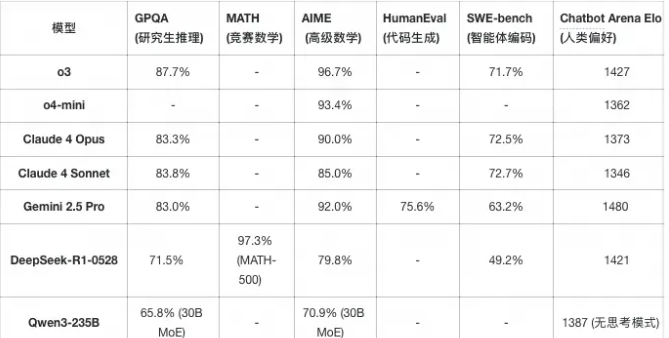 这一转变的背后逻辑是:随着模型普遍能力的提升,它们在MMLU等知识密集型、选择题式的基准上的得分开始集中在高端区间,难以拉开差距。2025年AI指数报告明确指出了MMLU、GSM8K和HumanEval等传统AI基准的饱和情况。作为回应,学术界和工业界将注意力转向了能够有效测试新一代推理能力的基准。AIME(高难度数学竞赛)、GPQA(需要研究生水平知识的问答)以及特别是SWE - bench(要求模型像软件工程师一样修复真实的GitHub问题),如今已成为Claude 4、o3和DeepSeek - R1等模型发布公告中频繁引用的事实标准。