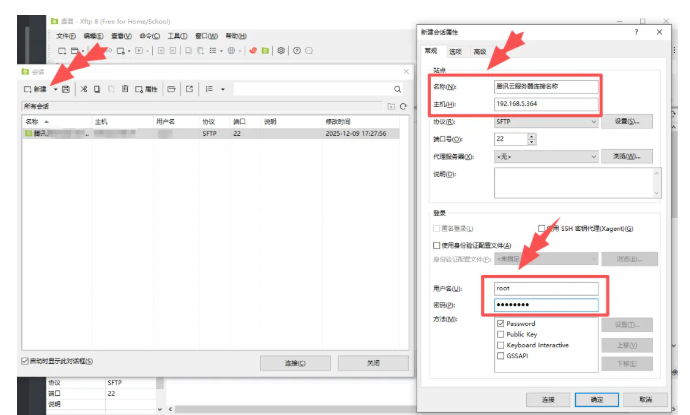 打开Xftp软件,新建连接会话,然后给这次连接起个名字,输入公网地址和密钥就能快速连接。