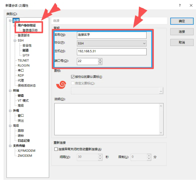 接下来说一下如何远程连接云服务器。用到了Xshell软件以及一些Linux命令。连接方法和前面的差不多,也是新建一个会话,然后输入公网地址和密钥即可。