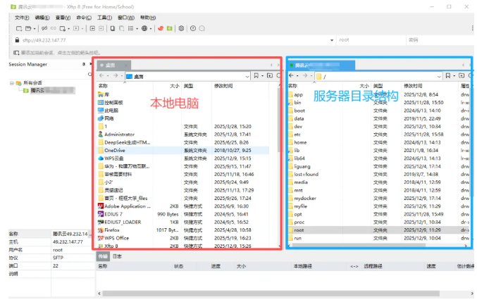 连接成功后,我们看到窗口左侧是你的本地电脑,窗口右侧是腾讯云服务器的资源目录。