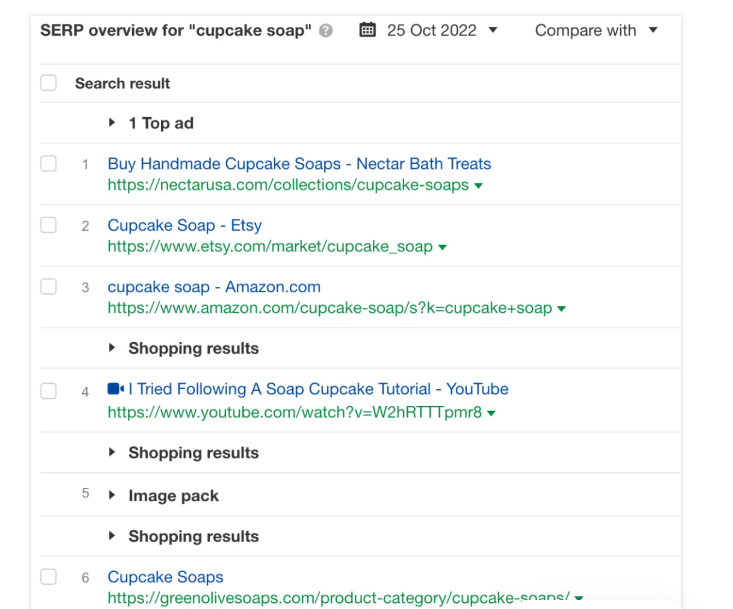 举例来说,关键词“杯子蛋糕皂”具有明显的交易意图,只有产品页面进入前十名。所以你在这个关键词排名的最佳选择,很可能是用一个提供杯子蛋糕形状肥皂条的页面。