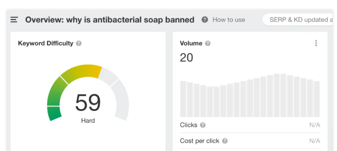 你可以用 KD 过滤器过滤掉竞争者拥有强大反向链接画像的关键词(如步骤#2 所示)。例如,我们估计要进入“抗菌肥皂为何被禁用”排名前十,你需要来自~123 个网站的反向链接。这个关键词很难排名,尤其是对新网站来说。
