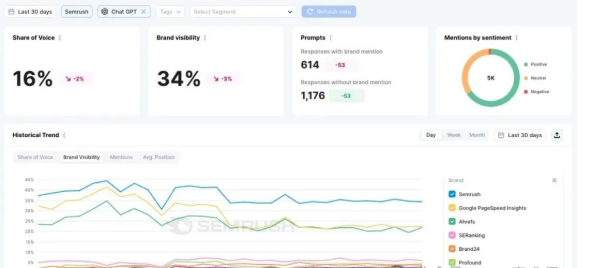 Sermrush的Enterpirse AIO工具每天监测您的品牌在AI结果中的存在,帮助您及时了解可见度的变化。