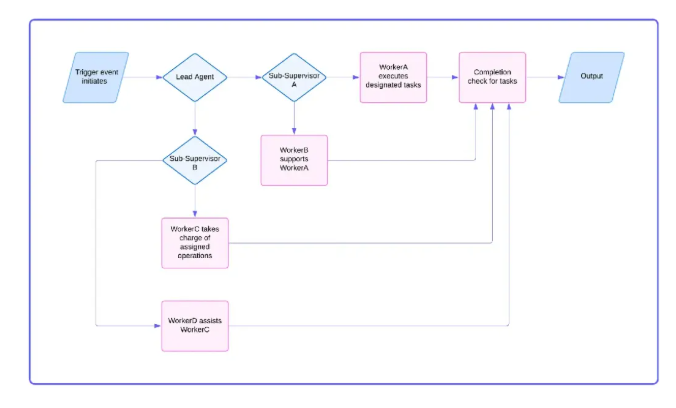 例如,在企业文档处理系统中,一个顶层智能体可能监督整个流程,将总结任务委托给一个中层智能体,将数据提取委托给另一个中层智能体,每个中层智能体管理自己的工作组。