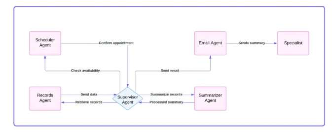 这种架构的一个实际应用可能是医院的专家预约系统。当患者发起请求时,监督者智能体控制整个工作流程: