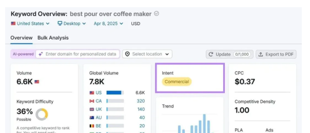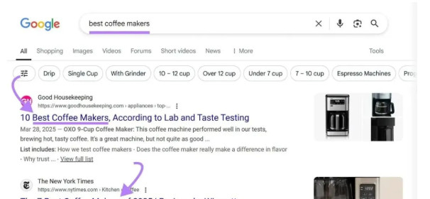 例如,如果你针对“最佳手冲咖啡机”,你会看到排名的文章——而不是产品页面。