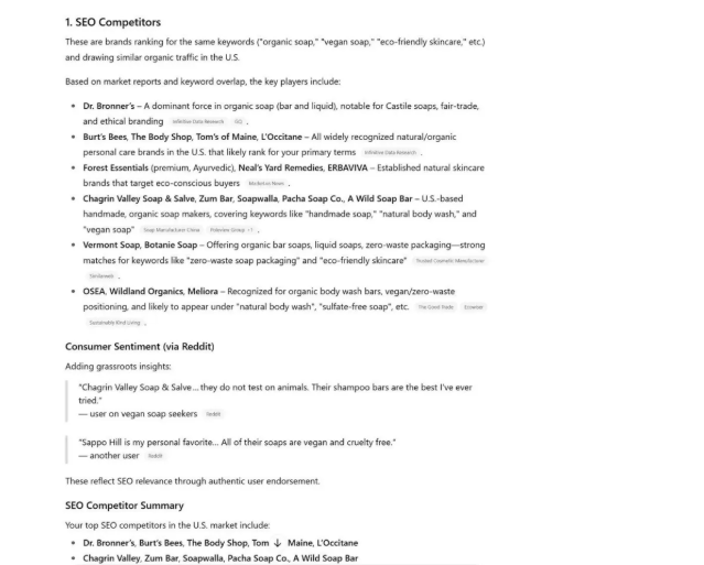 为了验证这些想法,可以将AI推荐的主题与竞争对手的关键词报告(如“有机研究”或“关键词差距”)进行比较,以确认竞争对手尚未在这些词汇中排名。这些差距是直接竞争有限的课题。