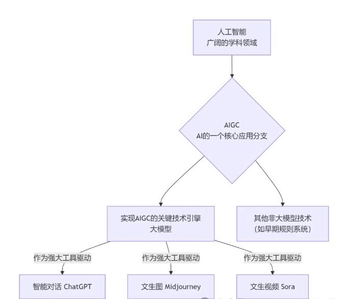 - AIGC:相当于 “画画或写作” 这项具体的技能,是AI在“内容创作”这个特定任务上的体现。