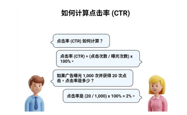 点击率(CTR)=(点击次数 / 曝光次数)× 100%