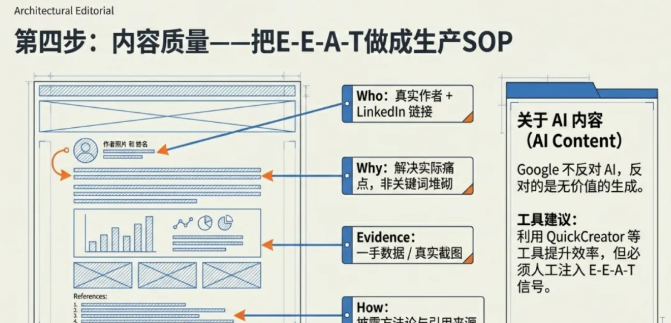 五、内容怎么写才符合 2026 的质量门槛:把 E-E-A-T 做成内容生产 SOP