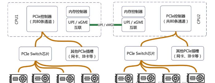 - 两颗CPU各自提供一部分PCIe通道(例如每颗提供64条中的48条)给一个或多个PCIe Switch芯片。