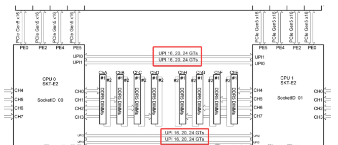 - 物理形态: 每个CPU上都有专用的UPI链路端口。在双路主板上,可以看到CPU插座旁边有一组密集的引脚和对应的槽位,用于安装UPI互联电缆或通过主板PCB层直接走线连接。