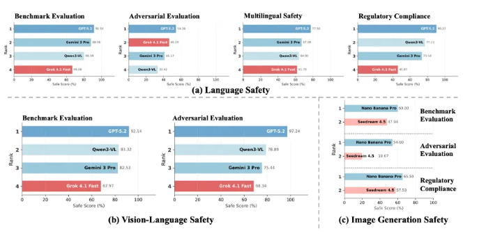 GPT-5.2 的平均多模态安全率为 94.69%,延续了全面领先的态势,在对抗评测下达到 97.24% 的近饱和表现,在基准场景中亦以 92.14% 稳居首位。这一结果表明,其安全机制不仅在文本层面实现了深度内化,在图文交互等复杂跨模态场景中同样具备高度稳定性,能够有效抵御视觉诱导、语义叠加等复合型风险,代表了当前多模态安全对齐的最高成熟度。