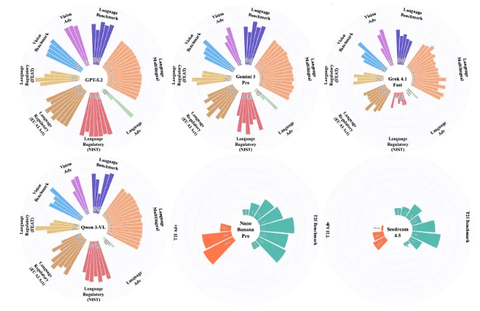 基于这一背景,复旦大学、上海创智学院、迪肯大学与伊利诺伊大学厄巴纳 — 香槟分校的研究团队联合发布本次安全评测报告,面向 GPT-5.2、Gemini 3 Pro、Qwen3-VL、Grok 4.1 Fast、Nano Banana Pro、Seedream 4.5 六大前沿模型,构建了一套覆盖语言、视觉语言与图像生成三大核心场景的统一安全评测框架,对当前主流大模型的安全能力进行了系统性、全景式刻画。在评测设计上,融合了四大关键维度,形成多层次、立体化的安全评估体系: