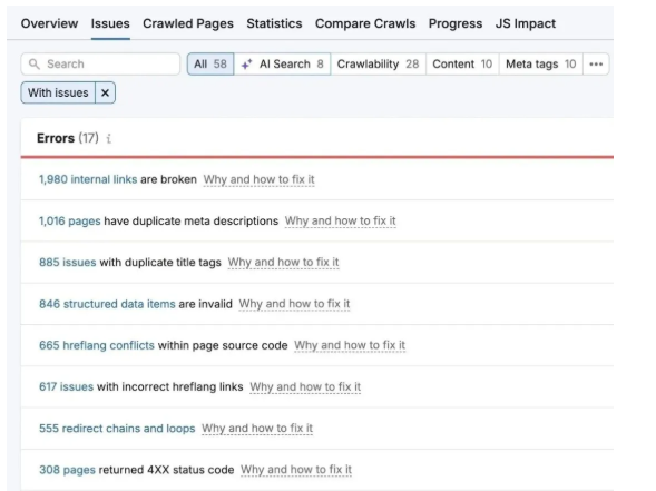 - 审查影响可见性和性能的问题:利用网站审计报告识别页面被阻挡、内容重复、加载缓慢或移动端可用性问题,这些都可能影响排名和转化率这种方法有助于确保着陆页满足SEO要求,同时不牺牲其主要转化重点。