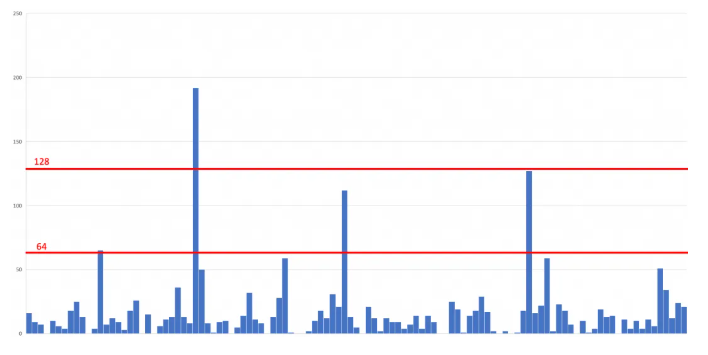 在小批量推理模式下,输入到MoE层中的Token总数有限,经过路由分配后,每个专家实际处理的Token个数变得稀疏。我们对线上真实场景进行了采样分析(Batch Size=4,平均序列长度576),下图是各专家的Token分配情况: