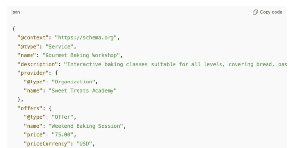 示例提示:“为名为’Gourmet Baking Workshop’的服务生成schema标记。请附上描述:“适合各水平的互动烘焙课程,涵盖面包、糕点和甜点。”提供者是’甜点学院’,还有一个叫’周末烘焙时段’的优惠,售价75美元。”