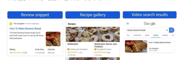 食谱图式带来了丰富的结果,包括图片、评分、烹饪时间和卡路里。这些片段视觉效果极强,通常以旋转木马格式展示。