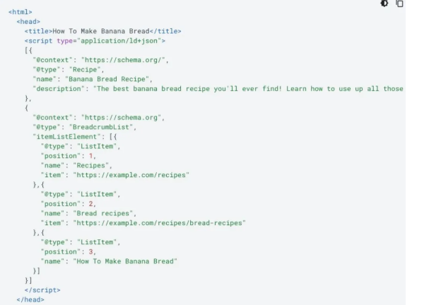 请看下面的结构化数据示例,显示同一页面上两个不同的项目:Recipe和BreadcrumbList。