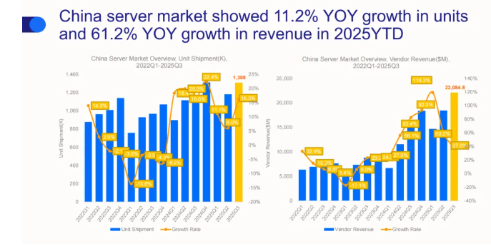 IDC数据显示,2025年第三季度,中国服务器市场整体同比增长 37.6%,其中: