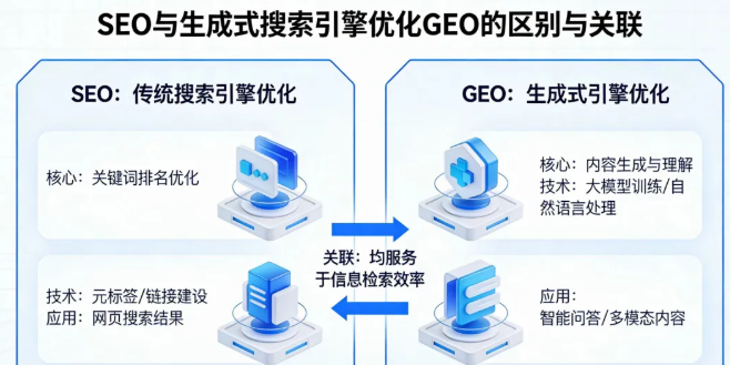 尽管差异显著,但SEO与GEO并非对立关系,而是覆盖不同搜索场景的互补策略,核心关联集中在三个层面: