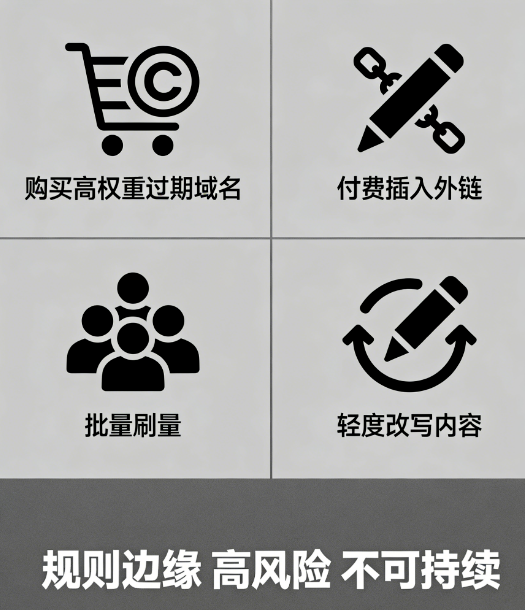 灰帽 SEO 虽未直接违规,但属于规则边缘的投机行为,长期来看同样不可持续,常见手段包括: