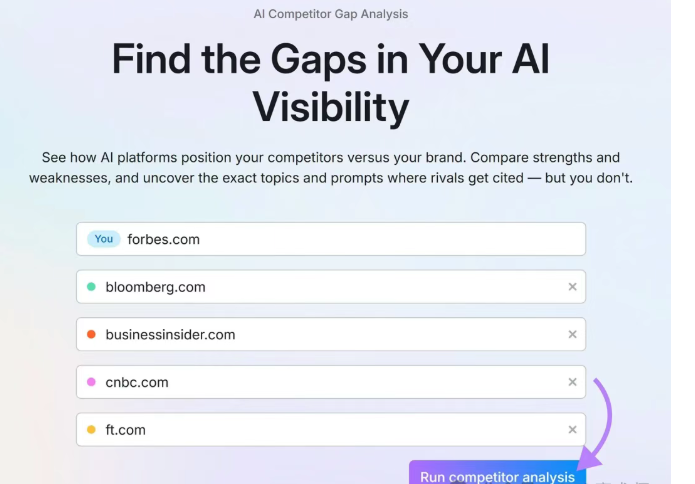 接下来,进入竞争对手研究,将你的域名与最多四个竞争对手一起输入。然后,点击“运行竞争对手分析”。