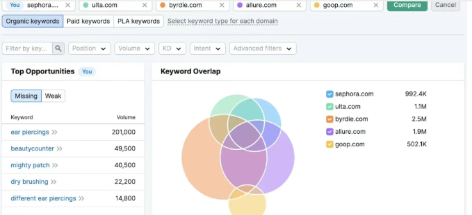 Keyword Gap 比较所分析域名的关键词组合,并列出关键词机会。