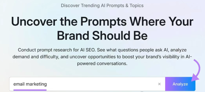 通过Semrush的AI可视化工具包识别受众使用的提示。进入提示研究,输入主题,点击“分析”。