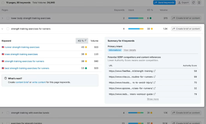 利用意图、难度和搜索量来优先排序关键词组。一般来说,搜索量较高、关键词难度较低代表最佳机会。