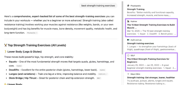 例如,对于关键词“最佳力量训练练习”,搜索结果页首先包含一个AI概览,列出了锻炼内容并详细说明了每个锻炼适合哪些部位。
