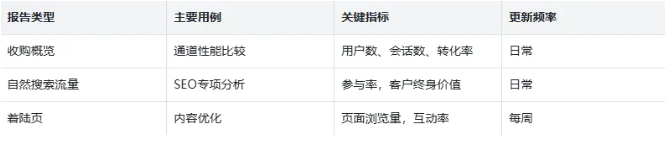 - 自然搜索流量报告:聚焦自然搜索表现,分析用户行为模式、地理分布及设备偏好,支持按着陆页、人口统计、时间段细分,适用于SEO专项分析,建议每日更新。