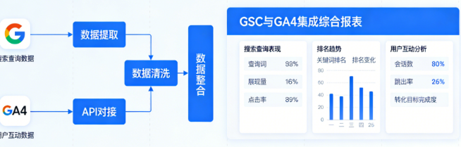 集成Google Search Console(GSC)与GA4,可实现从搜索展示到网站转化的端到端可视化,生成涵盖搜索效果与用户行为的全面报告。