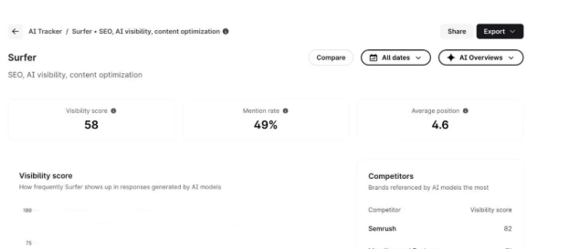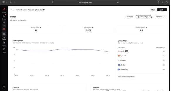 - 可见度评分:内容在AI搜索中被引用的来源或摘要中的突出程度。