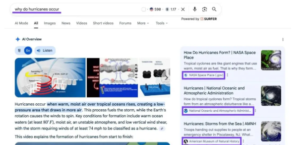 例如,您会注意到谷歌AI概述功能在生成摘要时,会明确标注内容来源网站。这正是AEO与GEO优化的关键所在。