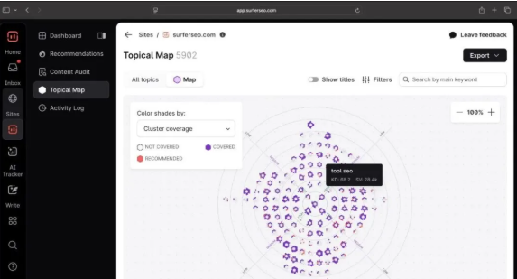 为简化这一流程,Surfer的主题地图功能可直观呈现页面关联性、主题重叠度,并揭示内容创新与数字化布局的机遇所在。