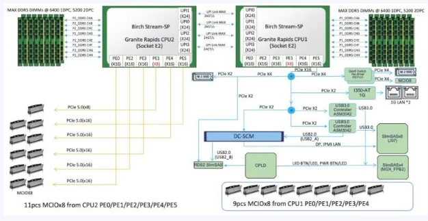 Intel Xeon 6700P处理器为该平台带来几个优势。每个处理器支持八通道DDR5内存,可以在2-DPC模式下运行,意味着每通道两个DIMM。这产生每个处理器十六个DIMM插槽,系统总共三十二个DIMM插槽。每通道填充两个DIMM的能力在AI工作负载中特别有价值,因为模型大小持续增长。虽然每通道运行两个DIMM通常会降低最大内存速度(与单DIMM配置相比),但对于许多工作负载而言,总容量优势往往超过边际带宽降低。