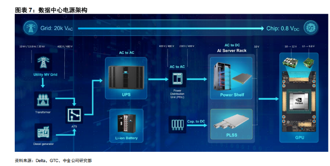 AI 服务器电源的基础架构如何?整体来看,AI 电源的架构从供电次序的角度来看主要分为三级:UPS—AC/DC—DC/DC。在数据中心的电力从电网传输到加速器芯片的过程中,电压要从 1-3 万伏特降低至 0.5~1 伏特,在这个过程中数据中心电源的架构主要分为保障电路 UPS、机架电源 AC/DC、芯片电源模组DC/DC 三个层级。