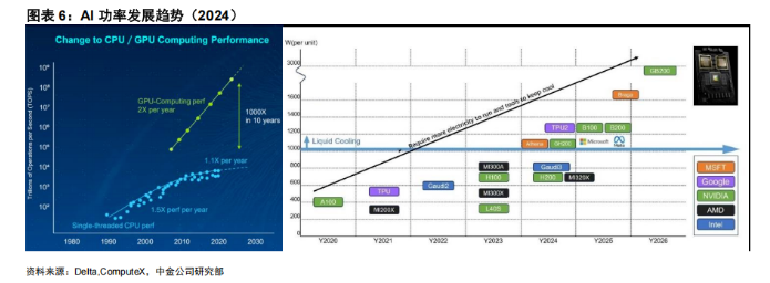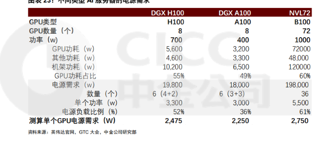 AI 服务器电源需求仍远大于其服务器的 GPU 功率需求,其一在于 CPU 等其他功耗占比,其二在于电源的冗余设计。服务器电源往往采用冗余设计,如前文台达电的测试数据所示,负载比例在 50-60%的区间内电源具有最好的效率表现,我们测算 DGX H100、NVL72 等先进 AI 服务器的电源负载比例也大多在 50-60%。此外考虑到 CPU、输等其他的损耗,GPU功耗占机架整体功耗我们预计约为 50-60%。