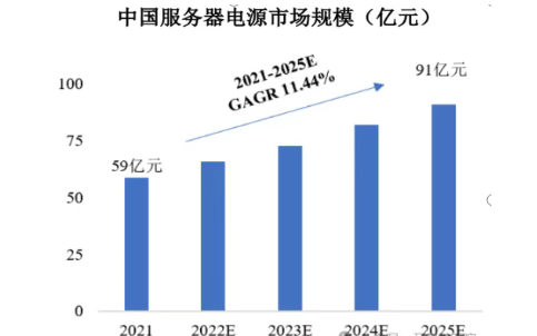 由于计算机产品在计算能力与数据处理能力方面的性能不断地提高,作为其中重要的组成部分的开关电源,其市场容量及产品规格也在一直提升、更新,且未来容量可能继续增加,整体市场规模巨大。据华经产业研究院数据,2021年中国服务器电源市场规模为59亿元,2025年有望达91亿元,2021-2025年复合增长率为11.44%。根据国金证券数据,2025年全球服务器电源市场规模将达316亿元,中国市场规模将达91亿元。
